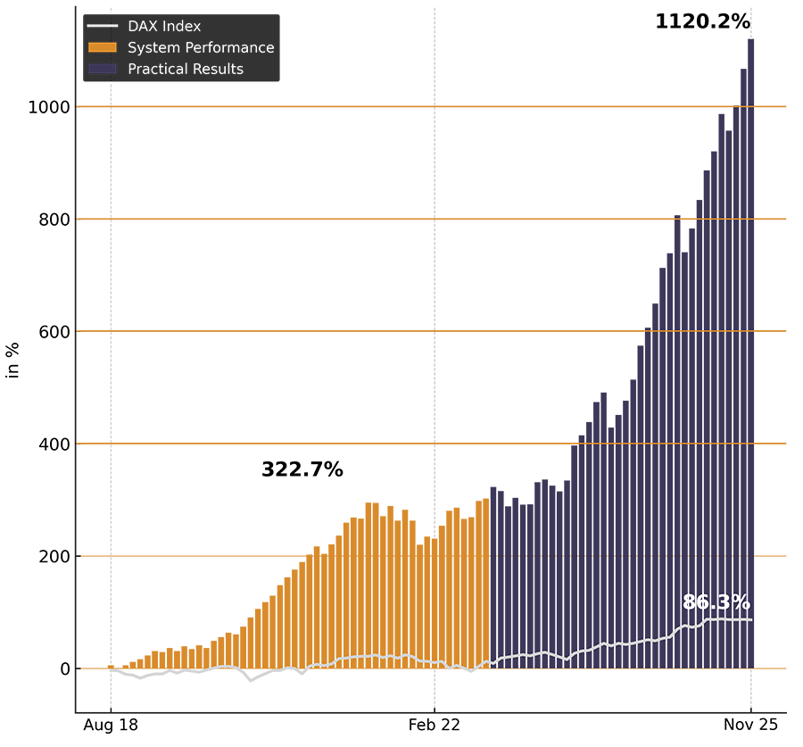 The graph impressively illustrates the so-called IDS effect: the IDS system achieves a significantly higher performance than the DAX index – both in long-term system operation and in practical application. While the DAX shows strong fluctuations and longer sideways phases over the period, the IDS System shows a continuously positive development with stable growth.